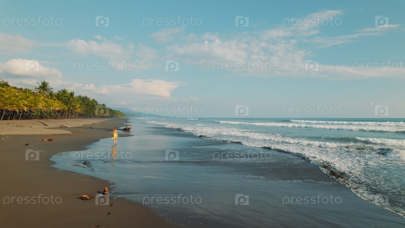 Женщина гуляет по береговой линии пляжа Линда с волнами и песчаным берегом в Коста-Рике
