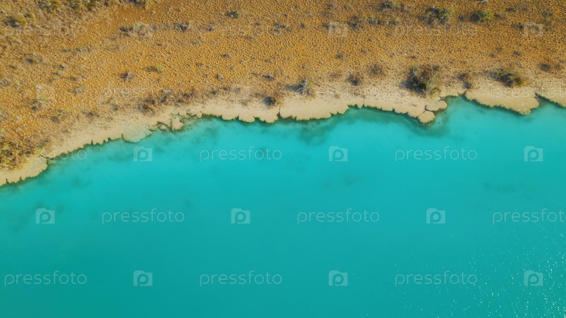 Вид с воздуха на береговую линию с бирюзовыми водами и сухой местностью в Бакалар Мехико