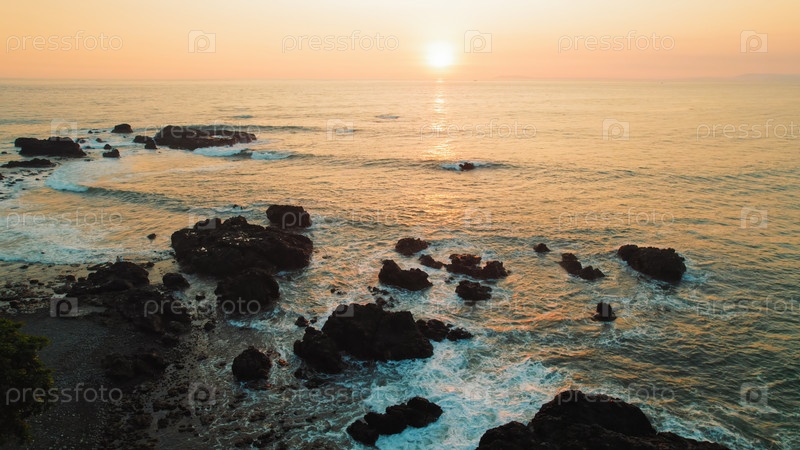 Скалистая береговая линия пляжа Яко освещена теплым золотым закатом света Коста-Рики