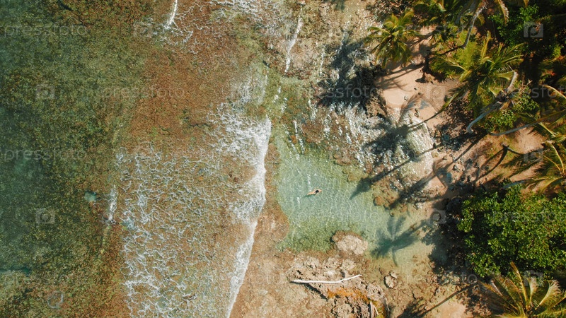 Женщина, плавающая в прозрачном приливном бассейне на тропическом песчаном пляже с пышными пальмами на солнце