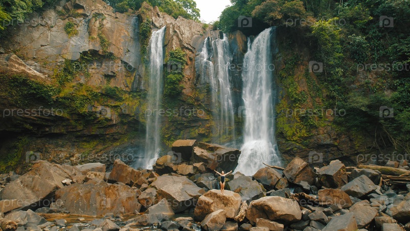 Женщина-путешественница гуляет по скалам возле водопадов Науяка, окруженных джунглями в Коста-Рике