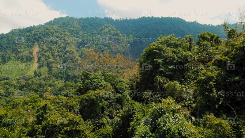 Полет беспилотника над густым тропическим лесом и Алмазным водопадом в Коста-Рике