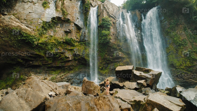 Женщина исследует скалы у основания водопадов Науяка в Коста-Рике