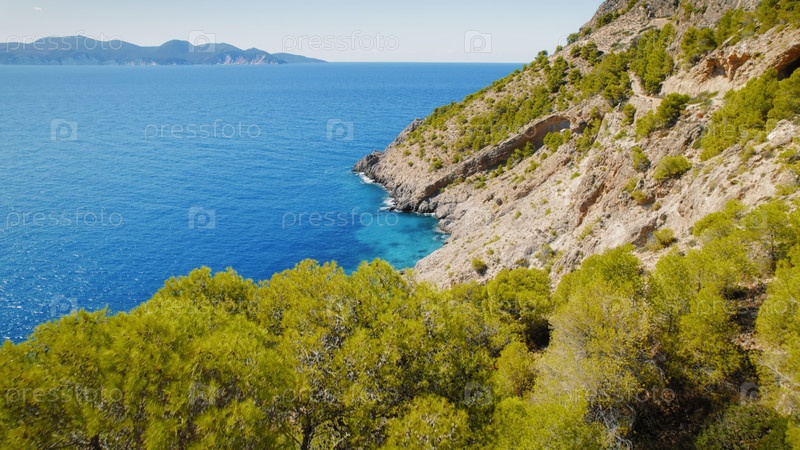 Бирюзовые прибрежные воды, встречающие скалистые скалы и зеленый сосновый лес в Кефалонии
