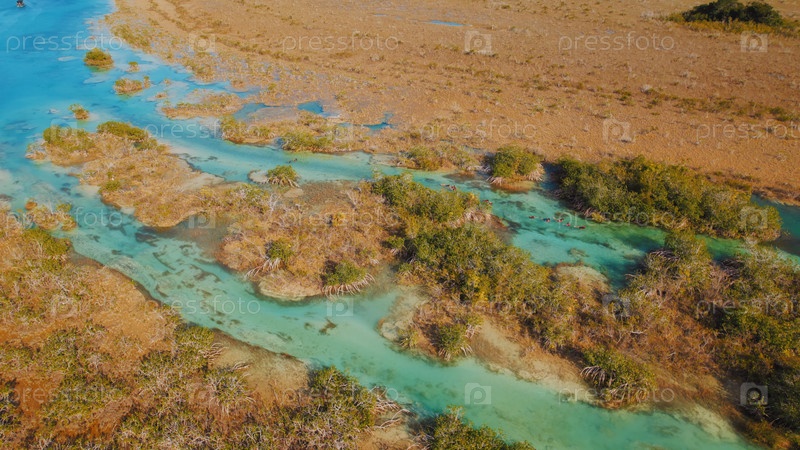 Вид с воздуха на людей, плавающих в прозрачной бирюзовой реке на пышных мангровых зарослях Мексики