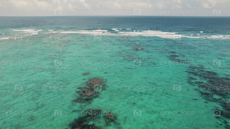 Мелкий риф виден через прозрачную бирюзовую воду Карибского побережья