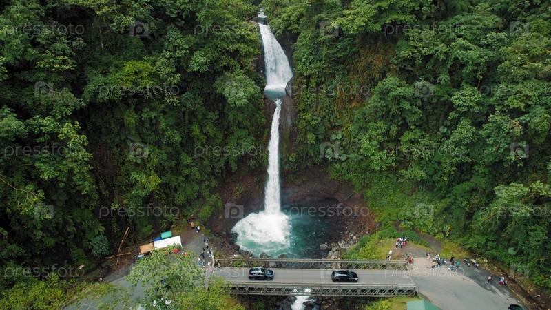 Водопад Ла-Пас падает рядом с мостом в окружении тропических лесов и туристов
