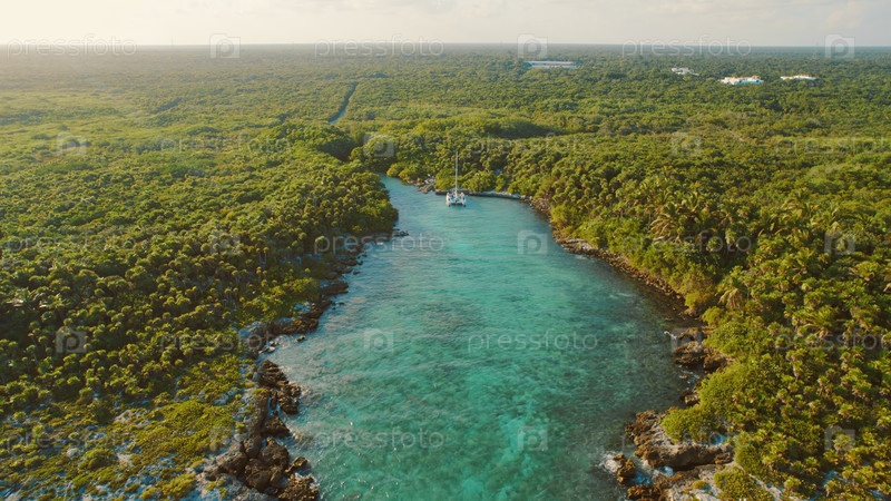 Вид с воздуха на бирюзовую лагуну с яхтой в тропическом лесу Юкатан в Мексике