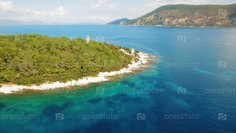Вид с воздуха на лесистую береговую линию и маяк возле морских вод в Кефалонии, Греция