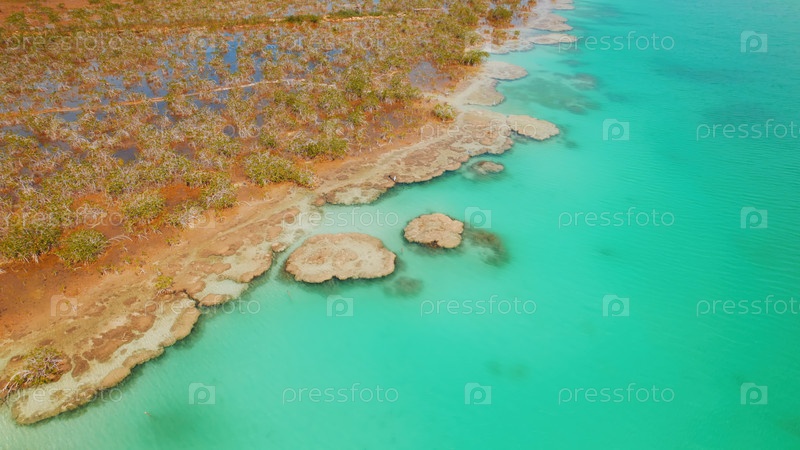 Мангровые водно-болотные угодья рядом с прозрачной бирюзовой водой лагуны Бакалар в Мексике