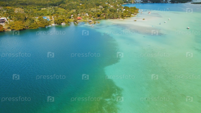 Вид с воздуха на лагуну Бакалар, показывающий градиент синего и зеленого тонов в Мексике