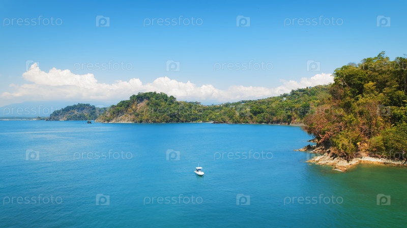 Лодка удовольствия плавает на бирюзовых морских водах недалеко от пляжа Бисанз в Коста-Рике