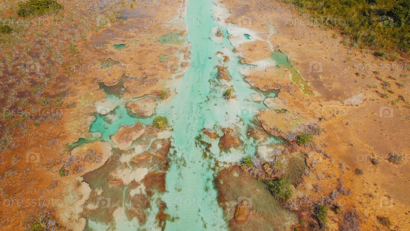 Вид с воздуха на бирюзовый водный канал, проходящий через лагуну Бакалар в Мексике