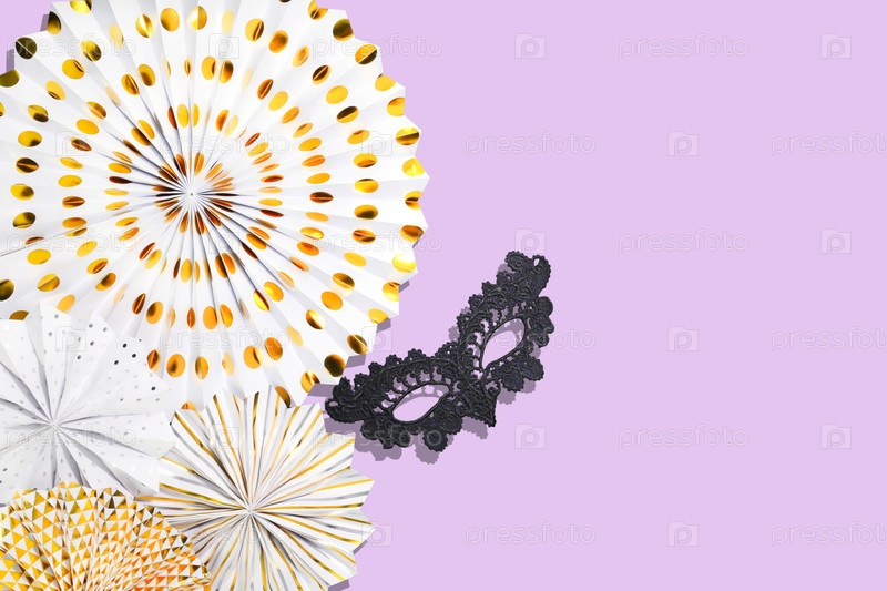 Masquerade Party Decor with Gold Paper Fans, Lace Mask and Mardi Gras Vibes on Pastel Purple Background. Концепция праздничного стиля, карнавального сезона и элегантных событий