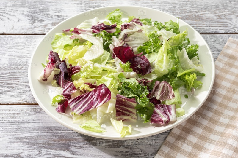Свежий смешанный салат из салата салата салата на деревенском столе для здорового питания Концепции потери веса Меню рецепты детоксикации или вегетарианский образ жизни с естественным светом и композиции кантри-стиля