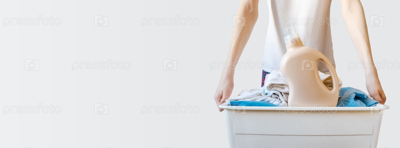 Баннер домашней прачечной с подростковой белой корзиной и детергентной бутылкой. Современный эстетический дизайн с копией пространства для бытовых услуг, чистящих брендов и экологически чистого домашнего маркетинга