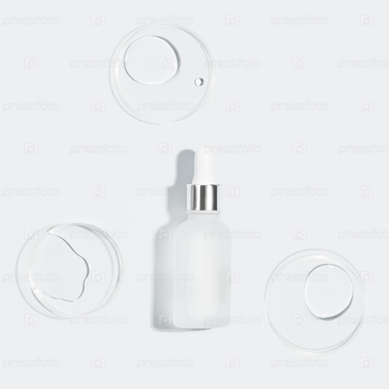 Биомиметическая сывороточная бутылка с активными экзосомными каплями на высокотехнологичном сером фоне
