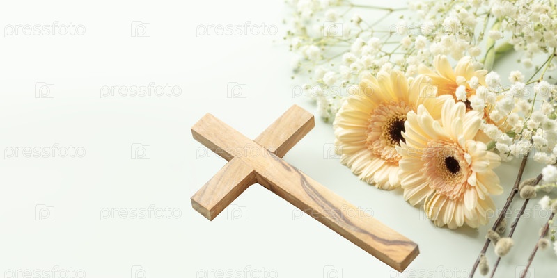 Деревянный христианский крест с желтыми цветами герберы на светло-синем фоне. Концепция Пасхи, религиозных праздников, духовности, надежды и оздоровления на основе веры для социальных сетей и религиозного контента