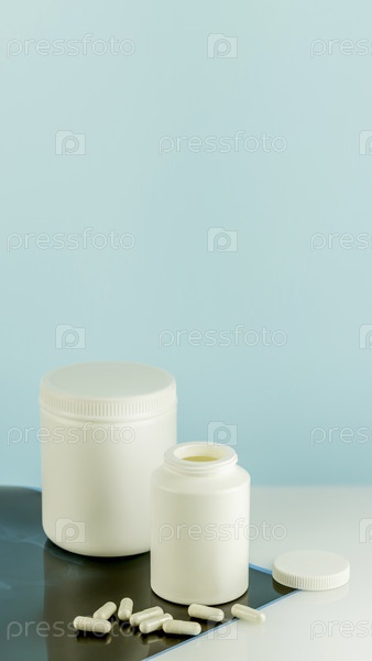 Капсулы белого кальция разбросаны по рентгеновской пленке рядом с пустыми медицинскими бутылками для представления добавок для здоровья костей, профилактики остеопороза и ортопедической концепции здравоохранения с копируемым пространством