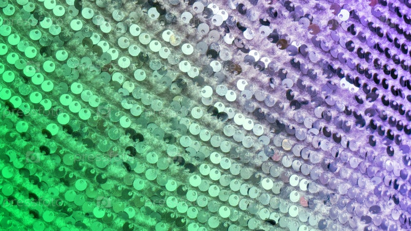 Праздничный фон включает в себя диагональные ряды блестящих изумрудно-зеленых и фиолетовых секвинов, чтобы представить карнавал Mardi Gras, декор вечеринки в стиле Нового Орлеана и брендинг мероприятия Shrove Tuesday