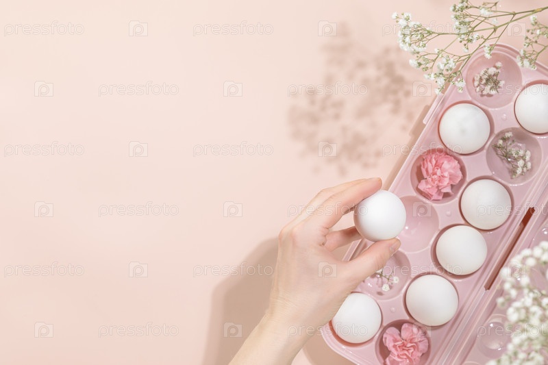 Пасхальная композиция с женской рукой, размещающей белые пасхальные яйца в розовую лодку, украшенную весенними цветами и гипсофилой, чтобы представить элегантную подготовку к пасхальным праздникам и весенний сезонный брендинг