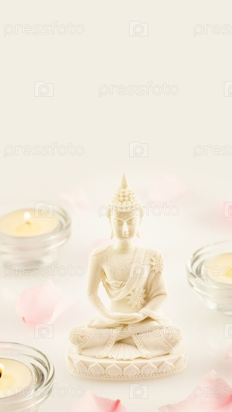 Белая статуя Будды, окруженная горящими чайными свечами и розовыми цветочными лепестками на ярком нейтральном фоне, чтобы представить медитацию, духовное просветление и день Будды, праздник Весак