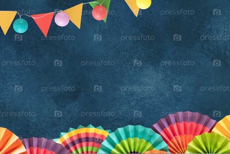 Фон Синко де Майо с красочными бумажными вентиляторами и праздничными флагами на темно-синей текстуре. Идеально подходит для мексиканской фиесты, праздничных мексиканских баннеров и маркетинга культурных мероприятий