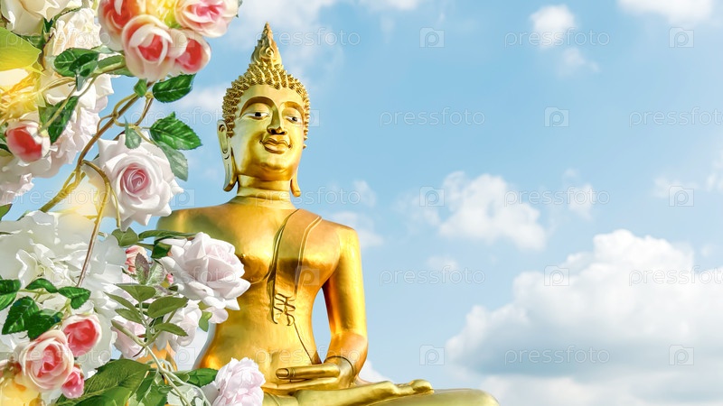 Золотая статуя Будды с цветущими розами на фоне ясного голубого неба