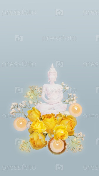 Вертикальная композиция с белой статуей Будды, желтыми розами и свечами