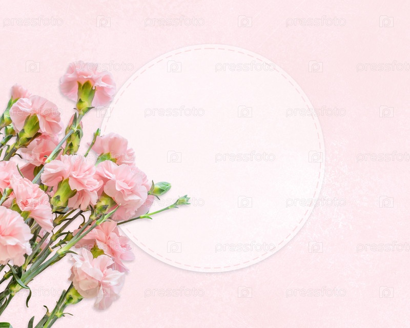 Цветочный праздничный макет с букетом розовых гвоздик и круглой пергаментной рамой