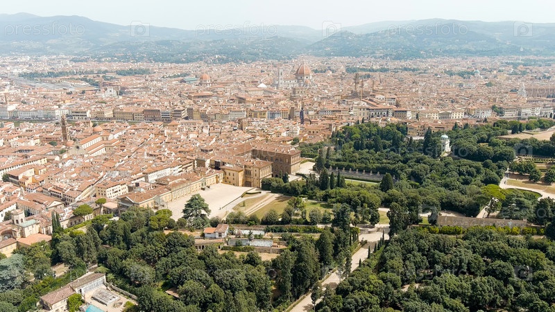 Флоренция, Италия. Палаццо Питти — Королевский дворец эпохи Возрождения. Сады Боболи (Giardino di Boboli) - классический сад 16-17 веков. Лето, вид с воздуха