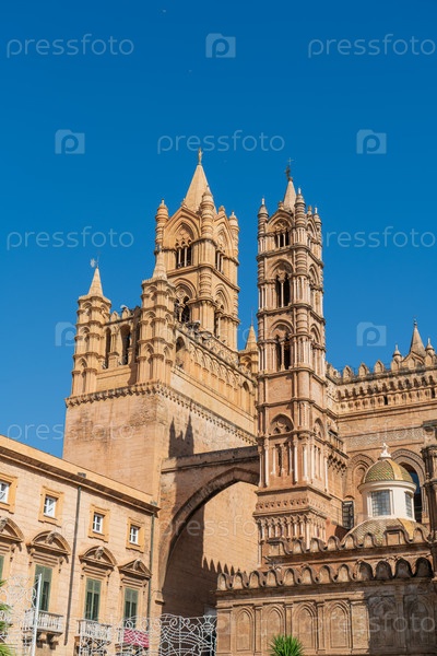 Палермо, Сицилия, Италия. Палермский собор — церковь 12 века. с четырьмя колокольнями и царскими гробницами. Солнечный летний день
