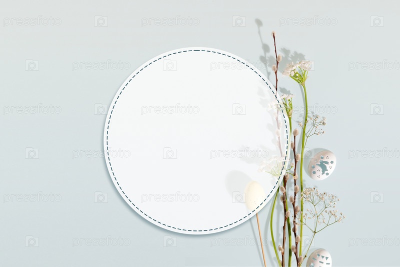 Круглая светлая рама с весенними ветвями и пасхальными яйцами на мягком фоне. Концепция Palm Sunday Greeting Card, христианский пасхальный праздничный шаблон приглашения, сезонный дизайн праздника Веры