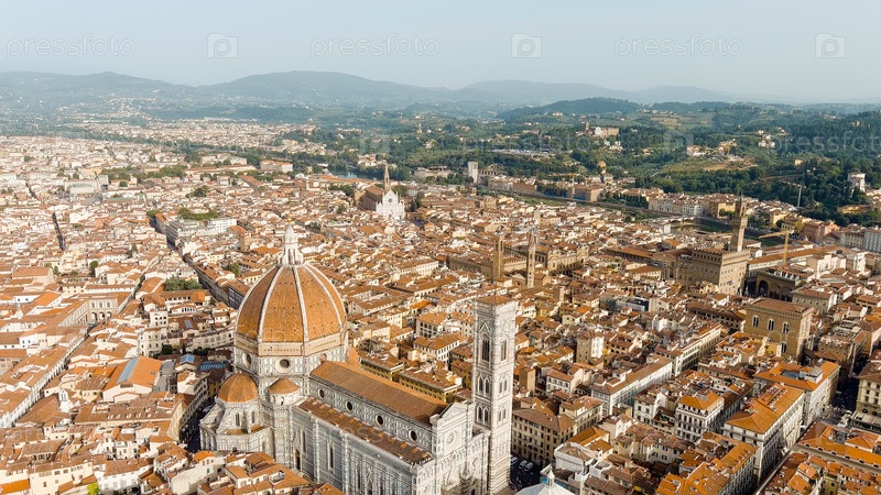 Флоренция, Италия. Собор Санта-Мария-дель-Фьоре. Панорамный вид на город. Лето. Вечер, вид с воздуха