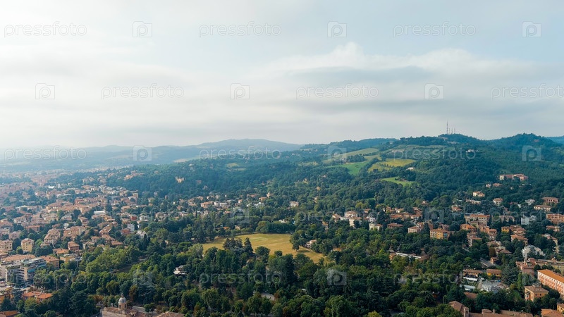 Болонья, Италия. Старый город. Панорамный вид на город. Лето, вид с воздуха