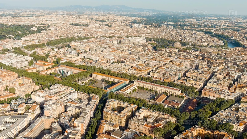 Рим, Италия. Общая панорама города. Административные здания в центре города. Вечернее время, вид с воздуха