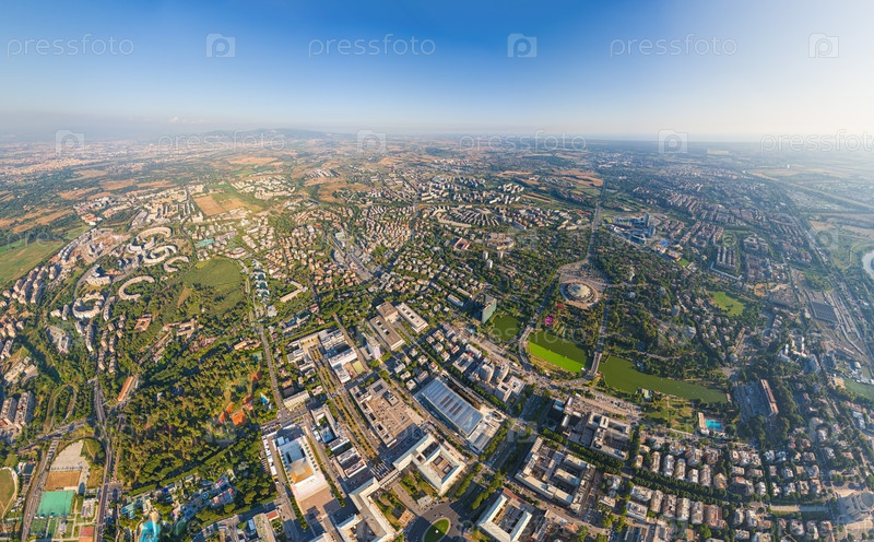 Рим, Италия. Квартал Всемирной выставки - EUR. Панорама города в летнее утро. Солнечная погода. Вид с воздуха