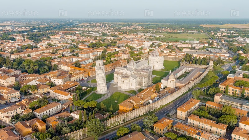 Пиза, Италия. Знаменитая Пизанская башня и Пизанский собор на площади Мираколи. Лето. Утренние часы, вид с воздуха