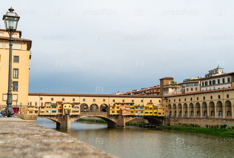 Флоренция, Италия. Понте Веккьо - средневековый арочный мост с сувенирными и ювелирными магазинами. Летний день