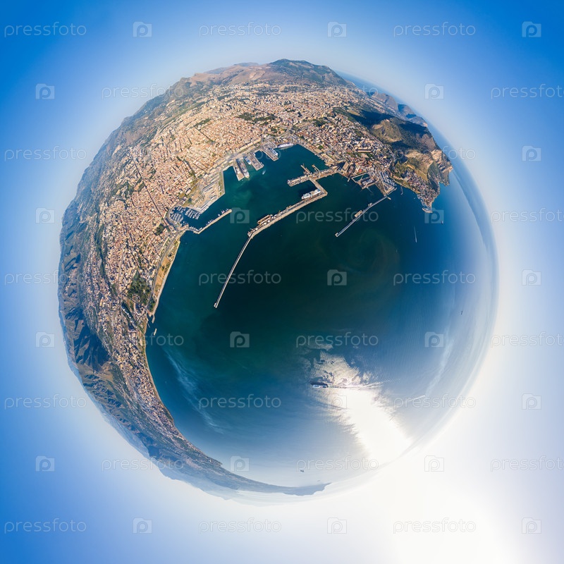 Палермо, Сицилия, Италия. Городской порт с кораблями и круизными судами. Солнечный летний день. 360-градусный панорамный астероид