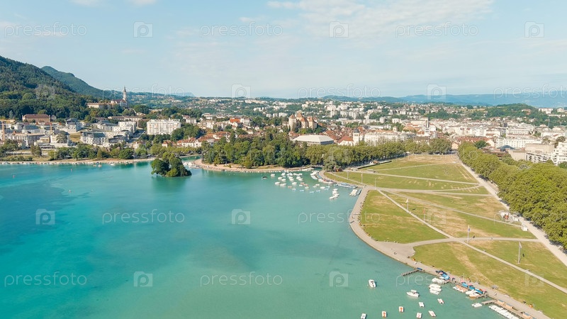Анси, Франция. Парк Le Paquier. Анси — город в Альпах на юго-востоке Франции. Набережная озера Анси, Aerial View