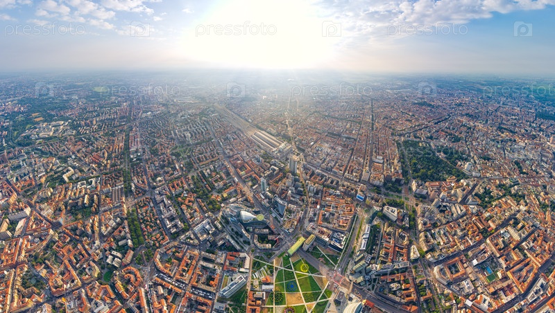 Милан, Италия. Ботанический сад и небоскребы. Панорама центральной части города. Летний день с облаками. Вид с воздуха