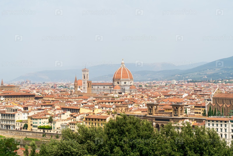 Флоренция, Италия. Санта Мария Дель Фиоре. Собор 13-го века, известный своим красным куполом, красочным мраморным фасадом и колокольней Джотто. Панорама города. Летний день