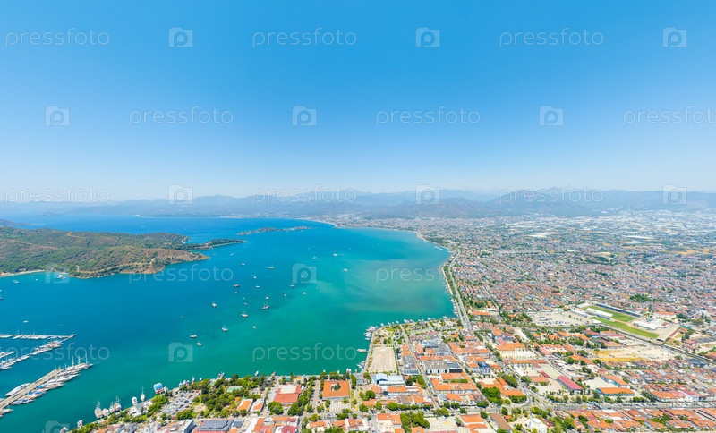 Фетхие, Турция. Воздушная панорама залива с яхтами, набережной и современным городом с береговой застройкой. Вид с воздуха
