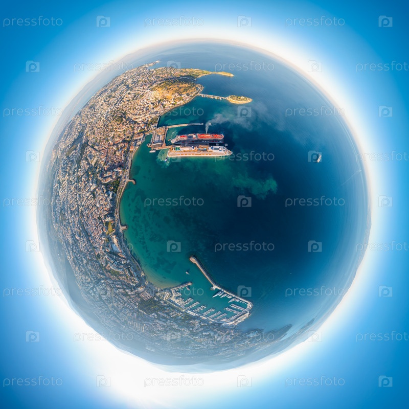 Кусадаси, Турция. Астероидный утренний вид. Эффект маленькой планеты фокусируется на бухте с двумя круизными судами на пирсе, яхтенной пристани. Остров Голубей, гора Кесе. 360-градусный панорамный астероид