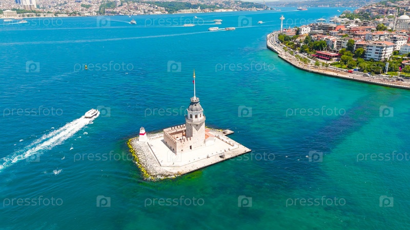 Стамбул, Турция. Детальный вид с воздуха на Башню Девы Киз Кулеси архитектура и структура на Босфоре. Вид с воздуха