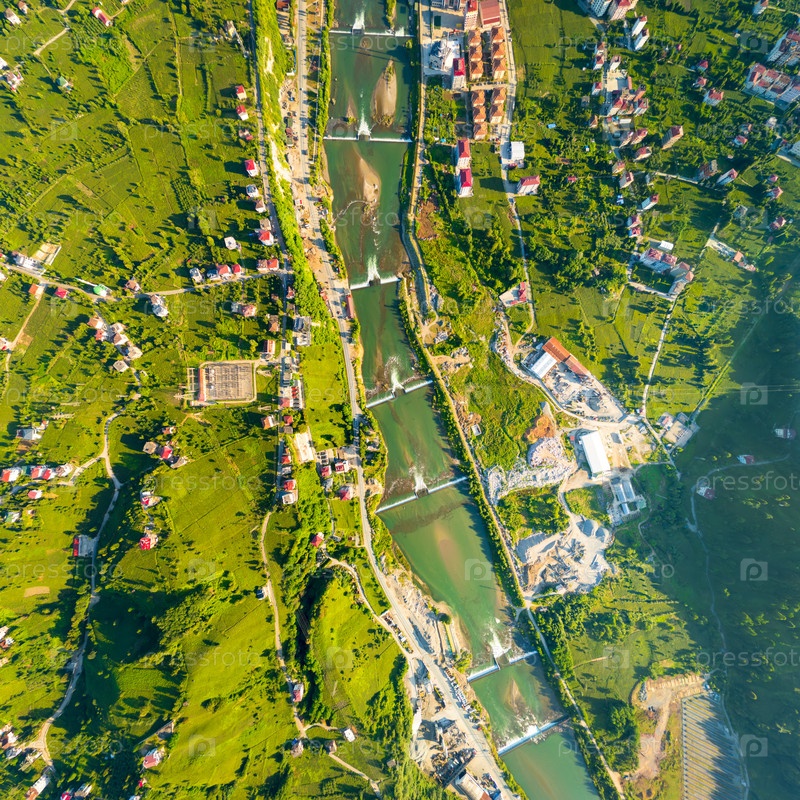 Ардешен, Турция. Город на черноморском побережье Турции. Долина реки Фиртина. Летнее солнечное утро. Панорама. Голова опущена. Вид с воздуха