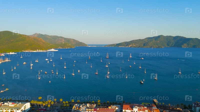 Мармарис, Турция. Роскошные яхты и парусники, стоящие на якоре в заливе Мармарис во время впечатляющего заката. Теплый золотой солнечный свет освещает спокойную воду и лесистые горы. Вид с воздуха