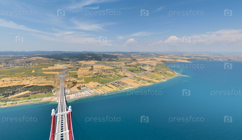 Лапсеки, Турция. Воздушная панорама к западу от пролива Дарданелл с мостом Канаккале 1915 года и европейским берегом в Гелиболу в солнечный день. Вид с воздуха