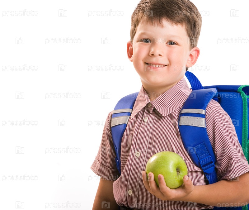 Мальчик с рюкзаком держит в руке зеленое яблоко, изолированный на белом фоне